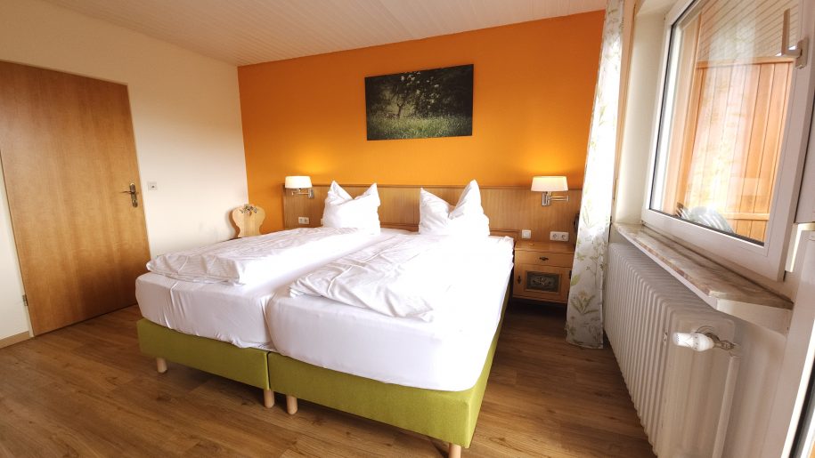 Helles und ruhiges Zimmer im Landhausstil mit separatem Bad (Dusche/WC) auf der anderen Flurseite. Sie haben einen wunderbaren Blick über Nieder-Moos und die Landschaft. Das Zimmer ist ausgestattet mit SAT-TV (Flachbildschirm) und Safe. Die Gästezimmer befinden sich im zweiten Stock.