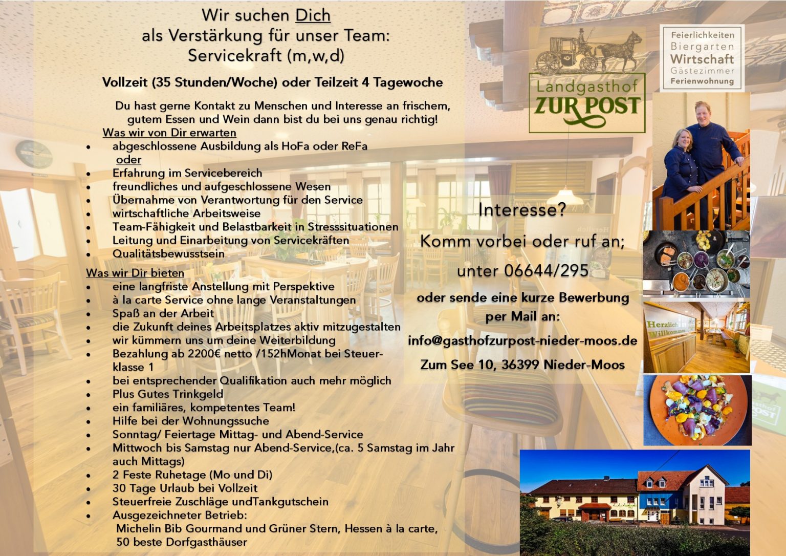 Stellenbeschreibung Du hast gerne Kontakt zu Menschen und Interesse an frischem, gutem Essen und Wein dann bist du bei uns genau richtig! Wir sind ein Gasthof mit ca. 60 Plätzen und dem Focus auf frische a la carte Küche mit regionale Produkten und einer kleinen Weinauswahl die wir gerne mit deiner Unterstützung weiter entwickeln wollen. Unser Schwerpunkt liegt im a la Carte Geschäft, welches mehrfach ausgezeichnet wurde( Michelin Bib Gourmand, Michelin Grüner Stern für Nachhaltigkeit, Varta Guide, Falstaff, Frankfurt geht aus, Hessen a la carte) sowie kleinere Feiern und Events. Eine Anstellung in 5 Tage Woche a 35h( Vollzeit ) oder 4 Tage (Teilzeit) ist bei uns möglich. Deine Aufgaben in unserem Team: -das selbständige Leiten einer Service-Station im Restaurant mit à la carte Service -die Vorbereitung und Organisation des Service (Mise en Place) -fachgerechtes Servieren von Speisen und Getränken -das korrekte Buchen der Bestellungen und Rechnungslegung -die Einarbeitung von Service Aushilfen in den Restaurantbetrieb -Vertretung der Restaurantleitung im Urlaubsfall -Mittelfristig Übernahme der Restaurantleitung Was wir erwarten: abgeschlossene Ausbildung als HoFa oder ReFa oder Erfahrung im Servicebereich freundliches und aufgeschlossenes Wesen Übernahme von Verantwortung für den Service wirtschaftliche Arbeitsweise Team-Fähigkeit und Belastbarkeit in Stresssituationen Leitung und Einarbeitung von Servicekräften Qualitätsbewusstsein Was wir bieten: eine langfriste Anstellung mit Perspektive, à la carte Restaurant ohne überlange Veranstaltungen Spaß an der Arbeit die Zukunft deines Arbeitsplatzes aktiv mitzugestalten wir kümmern uns um deine Weiterbildung faire leistungsgerechte Bezahlung Steuerfreie Zuschläge gerechte Trinkgeld Verteilung ein familiäres, kompetentes Team! betriebliche Altersvorsorge Fahrtkostenzuschuss Tankgutschein 30 Tage Urlaub bei Vollzeit 2 Feste Ruhetage (Mo und Di) Sonntag/ Feiertage Mittag- und Abend-Service, Mittwoch bis Samstag nur Abend-Service,(ca. 5 Samstag im Jahr auch Mittags) Wir haben ein Team aus Festangestellten und Aushilfen mit dem wir es sehr gut hinbekommen eure Freizeitwünsche trotz Wochenendarbeit zu Organisieren Ausgezeichneter Betrieb: Michelin Bib Gourmand, Grüner Stern, Hessen à la carte, 50 beste Dorfgasthäuser Art der Stelle: Vollzeit, Teilzeit, Festanstellung Erwartete Arbeitsstunden: 28–35h pro Woche Arbeitszeiten: Abendschicht Feiertagsarbeit Wochenende Spätschicht Wochenendarbeit Leistungen: Betriebliche Altersvorsorge Betriebliche Weiterbildung Firmenevents Flexible Arbeitszeiten Kostenlose Getränke Kostenloser Parkplatz Preisnachlässe auf Produkte/Dienstleistungen des Unternehmens Sonderzahlung: Trinkgeld Überstundenzuschläge Zusatzzahlungen Berufserfahrung: der Gastronomie: 2 Jahre (Erforderlich) Sprache: Deutsch (Erforderlich)